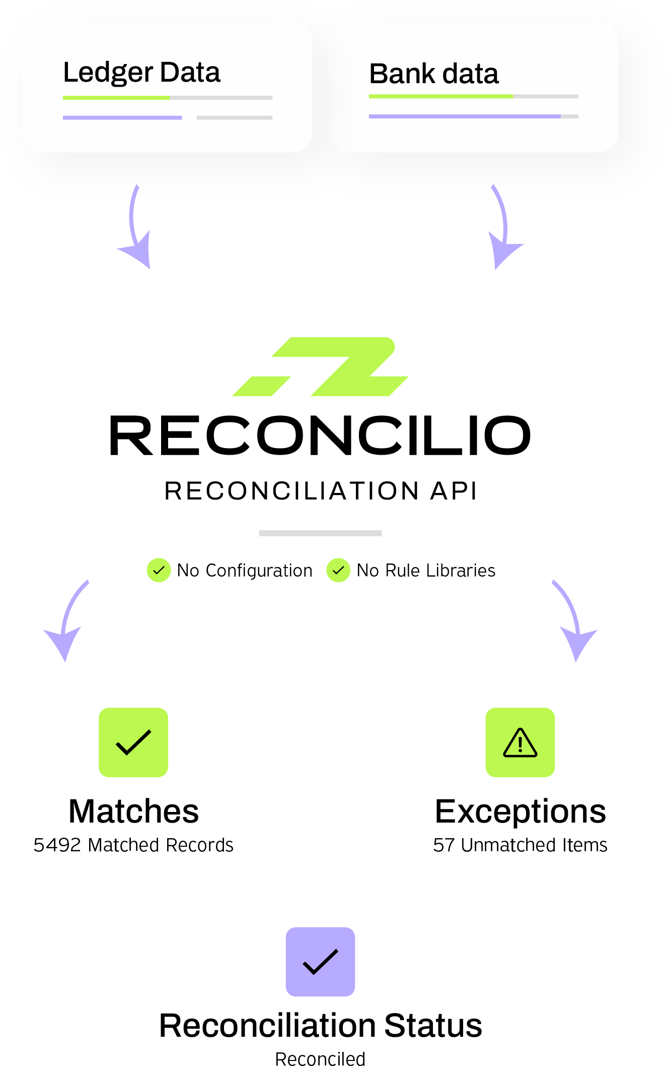 No configuration. No rule libraries. Reconciliation that works out of the box.