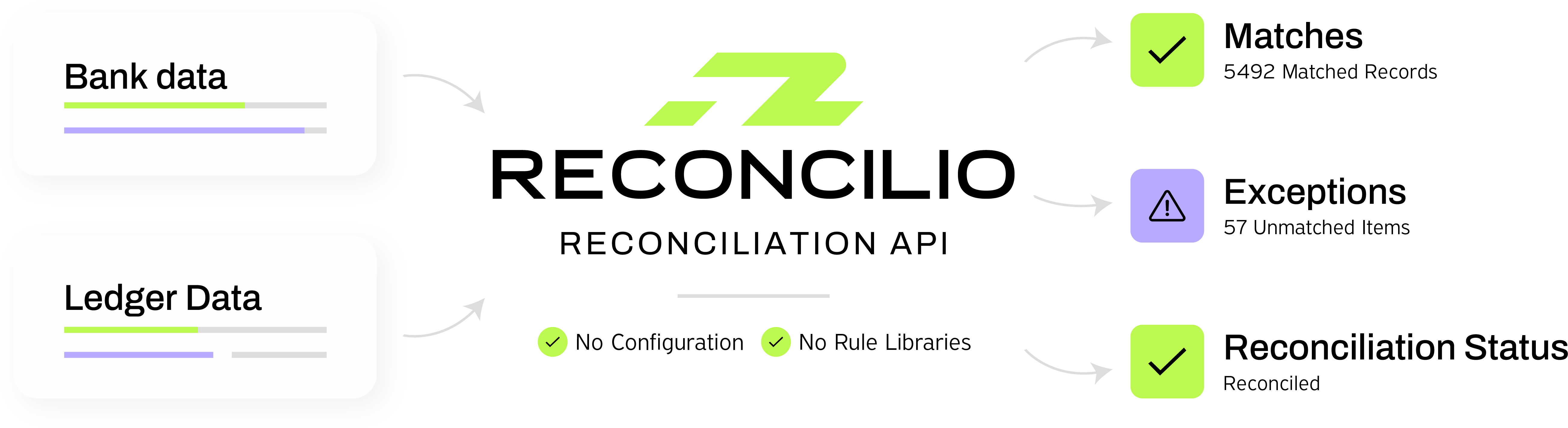 Reconcilio’s Reconciliation API takes your transaction feeds and returns matches and exceptions your platform can act on immediately.